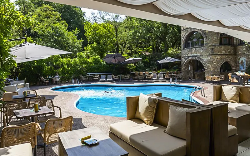Απολαύστε το μπάνιο σας στην πισίνα, σε ένα χώρο χτισμένο και διακοσμημένο με αρχαιοελληνικές πινελιές η οποία λειτουργεί καθημερινά και τα Σαββατοκύριακα.