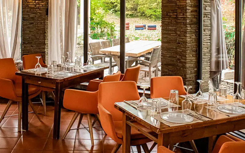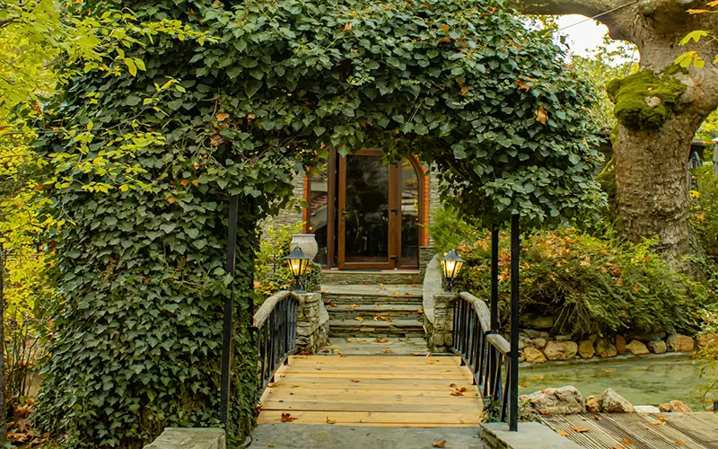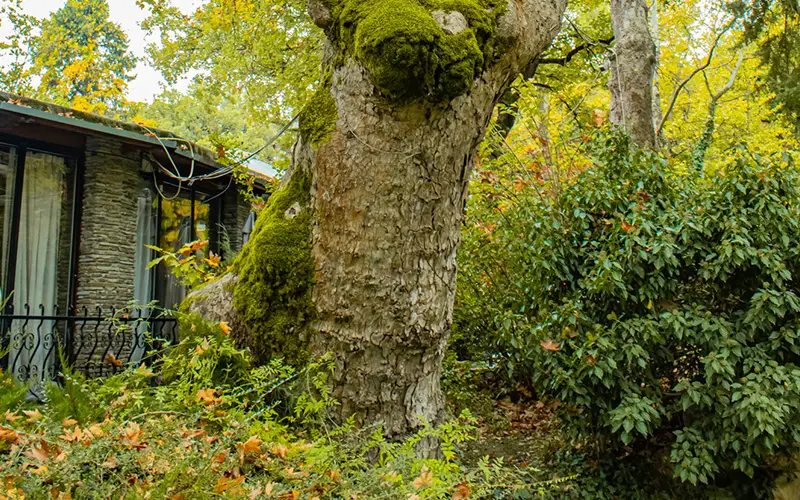 Το καλοκαίρι, που αφαιρούνται οι τζαμαρίες, θα βρεθείτε σε έναν ημιυπαίθριο χώρο με θέα το κατάφυτο δάσος υπό τον φυσικό ήχο που προκαλεί το κελάηδημα των πουλιών και το νερό που τρέχει από το παρακείμενο συντριβάνι.
